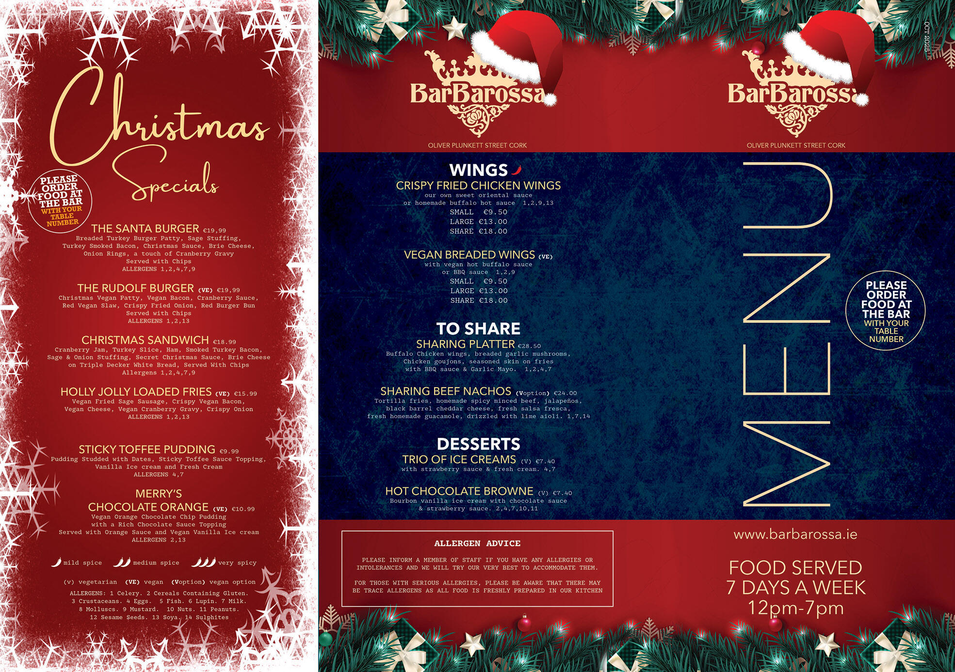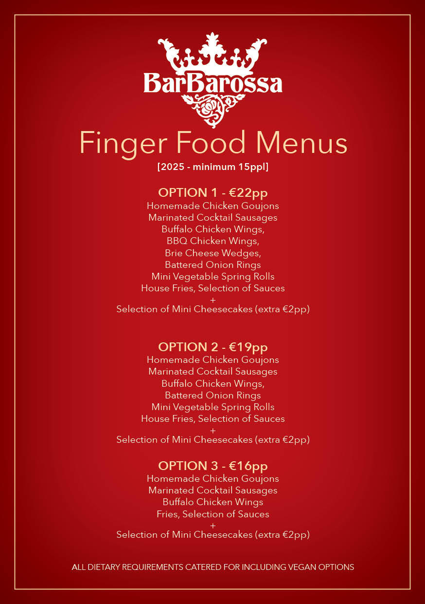 Our kitchen is open 7 days a week from 12noon - 7pm. Serving Soup & Sandwiches, Traditional Irish Main Courses, Burgers, Salads, Tex Mex plus some Sharing plates and a great choice of Vegan options. Pop in for a light bite or a filling meal. Walk-ins welcome & bookings taken, just email us on : info@barbarossa.ie